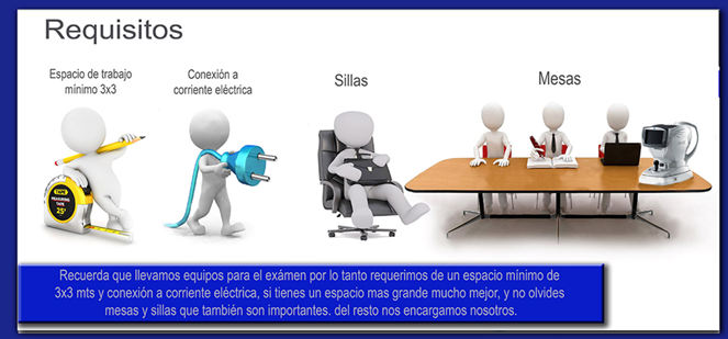 Requerimos un espacio de 3 x 3, oficina, sala de juntas o bodega, que tenga conexiòn de corriente electrica cercana, 4 mesas o tablones largos, 5 sillas para el equipo de optometria mas las sillas que se necesiten para los pacientes.